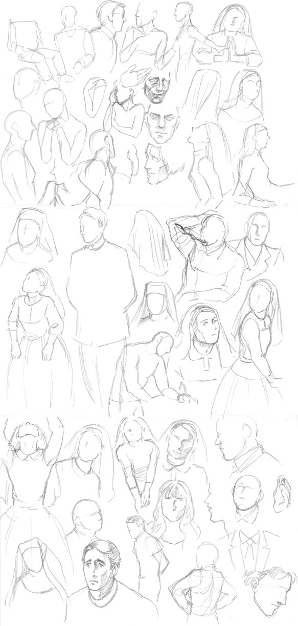 本を見ながら(左)と落書きや見たドラマのシーンを思い出しながら(中)とイメージから顔描き分け練習(右)。