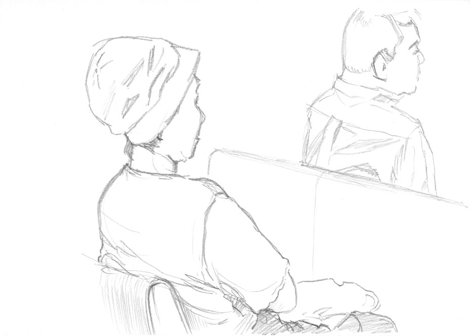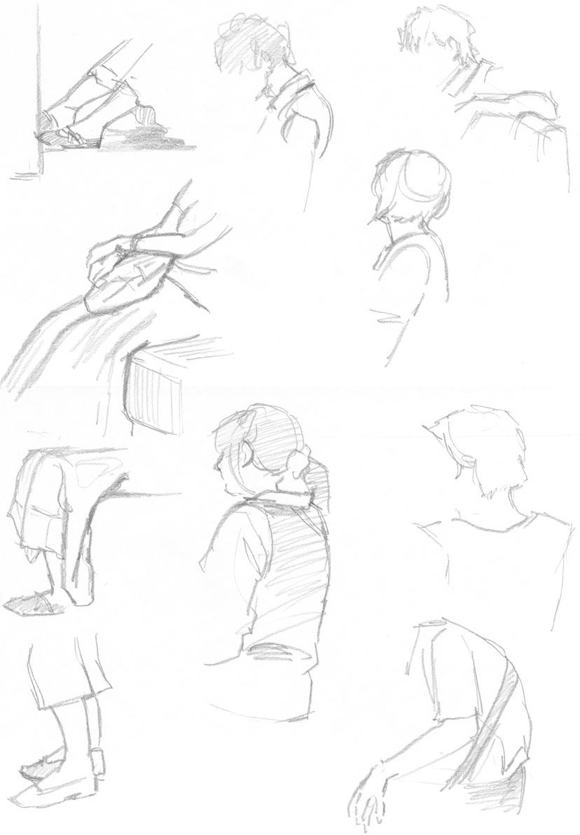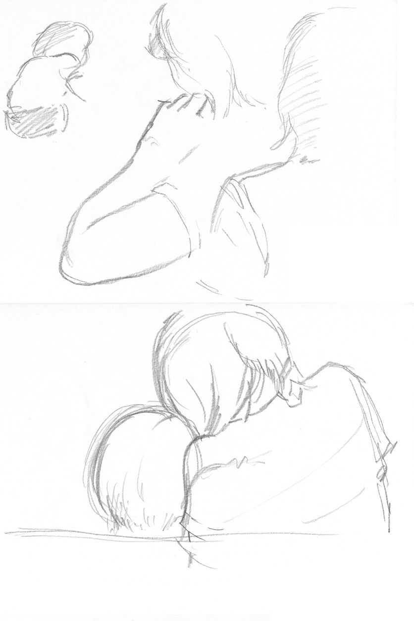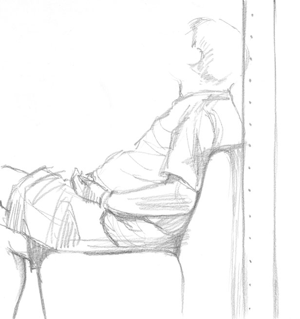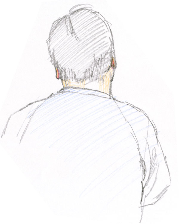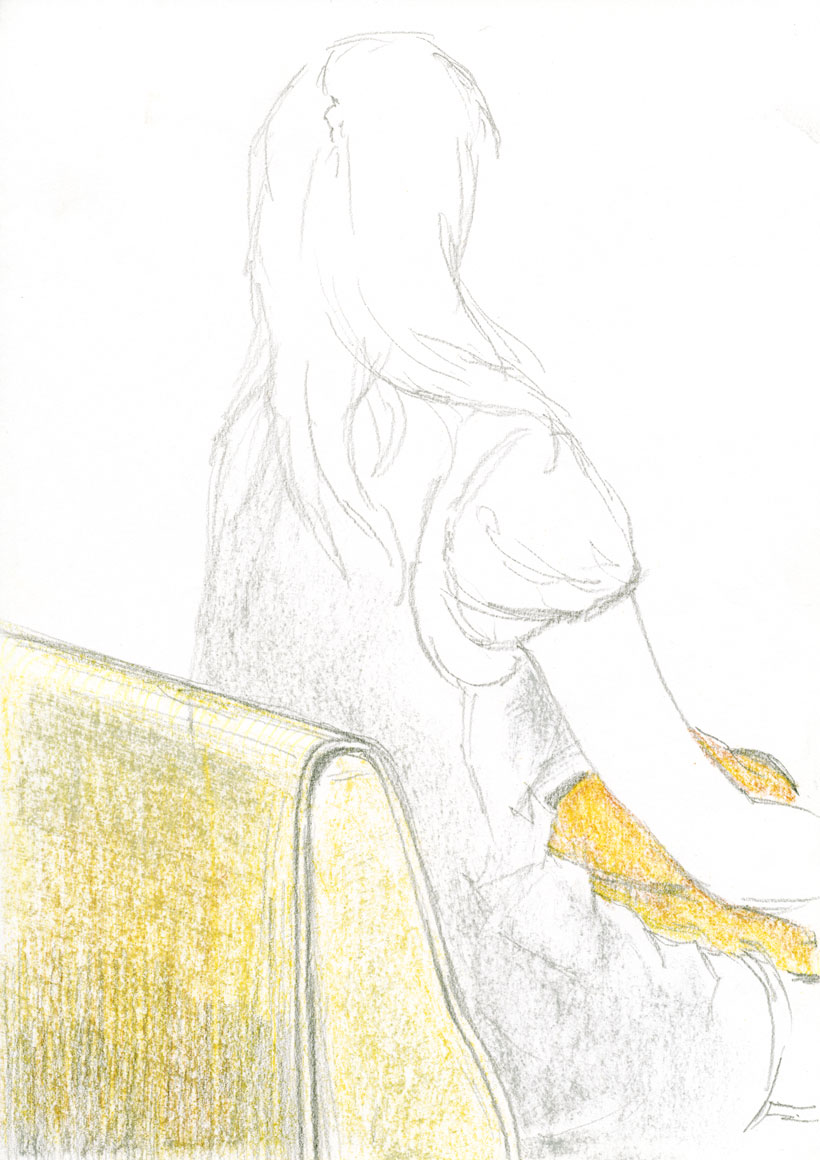 - 予告してあった通り、携帯サイズな色鉛筆セットを携え、病院待合室(※付き添いです)でのクロッキー、ついにカラー化!(笑)