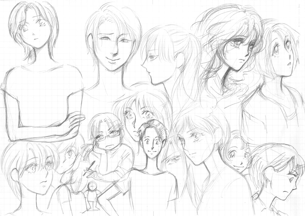 イメージから顔の描き分け練習。(左上だけ腕の骨練習が紛れ込んでますが…/笑。)上段、右から2個目が「イメージを形にする」という意味で良く描けた。