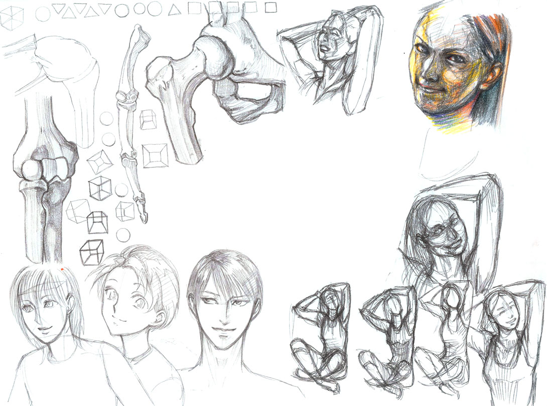 今日の物欲(笑):白墨液と消せる色鉛筆が欲しい…。 - やっぱり色っていいなあ。この画像の右上のようなメモ的使い方(色塗ってるんじゃなく、練習する・形を取るのに「色を使ってる」だけ)でも、(描く課程の偶発で)目の前に綺麗な色が出てくるとテンションあがる。