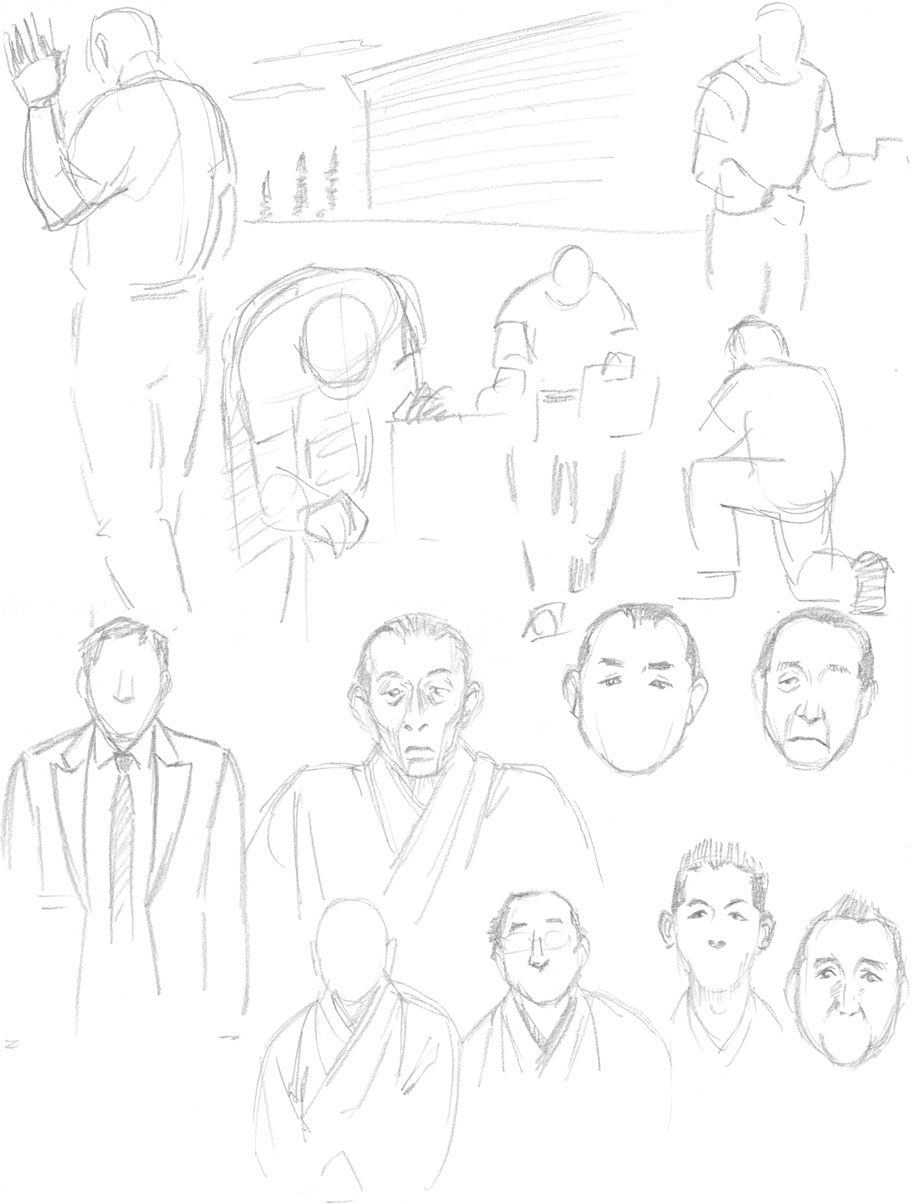 TV見ながら。下段右側は「笑点」メンバー。寄席は姿勢もあまり変わらず人物も正面位置から撮るから描き易そうかと思ったのですが、案外と個々人が映ってる時間は長くなかったりして描ききれなかった。シワ観察までの余裕がないので若返ってしまう…(笑)。