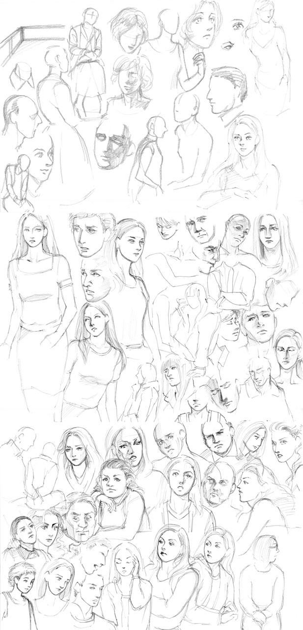 イメージから顔の描き分け練習。(左上だけ腕の骨練習が紛れ込んでますが…/笑。)上段、右から2個目が「イメージを形にする」という意味で良く描けた。